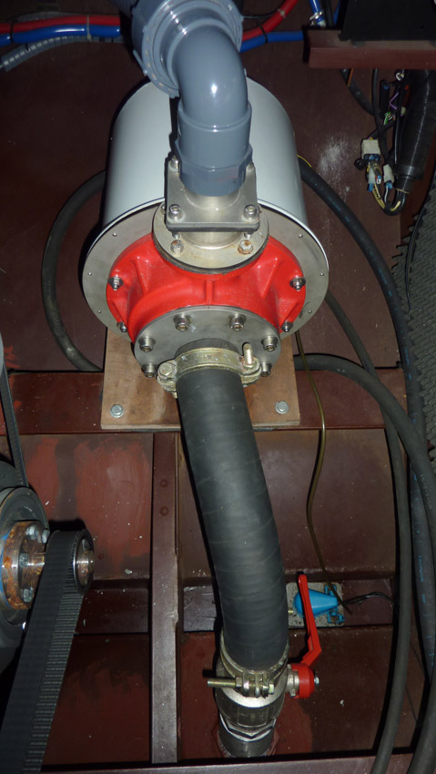 Durch den Siphon, der über die Wasserlinie gehen muss, kann kein Wasser einlaufen. Nur die Impellerpumpe drückt das Wasser über den Siphon.