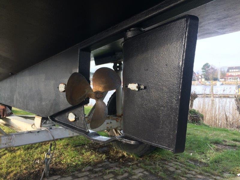 Der bauliche Aufwand bei dieser Variante und die Eingriffe in den Schiffskörper sind nicht unerheblich. Die Platzierung und das nachträgliche Einschweißen eines Schraubentunnels können Probleme und Risiken bergen. Wird der Tunnel nicht gut platziert und integriert können sich hydronamische Auswirkungen ergeben. Wie z.B. kavitative Strömungen oberhalb des Ruderblattes oder eine erhöhte strömungsbedingte Galvanik, die sich langfristig negativ auswirken können. Auf alle Fälle ist eine gute nachträglich Konservierung Innen wie Außen wichtig. Der Antriebsmotor der Schraube befindet sich, im Heck direkt vor dem Spiegel, unter dem Bett in der Eignerkabine.